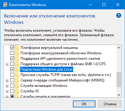 Если WSL ещё не включена, то необходимо это сделать в панели управления. Выбираем «Установка и удаление программ», затем «Включение или отключение компонентов Windows». Там необходимо установить галочку напротив пункта «Подсистема Windows для Linux»: