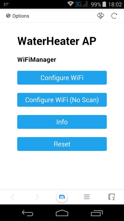 Для того чтобы настроить точку доступа, к которой будет подключаться наш водонагреватель, подключаемся к точке WaterHeater AP на смартфоне/ноутбуке и переходим по адресу 192.168.4.1 .