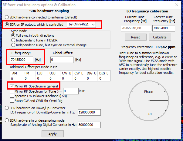 Нажимаем Options —> RF Front-End + Calibration. Появится окно настроек. Включаем отмеченное на скриншоте. В поле «IF-frequency» вводим частоту ПЧ. Этим самым мы дали понять программе, что на вход SDR мы подаём промежуточную частоту: