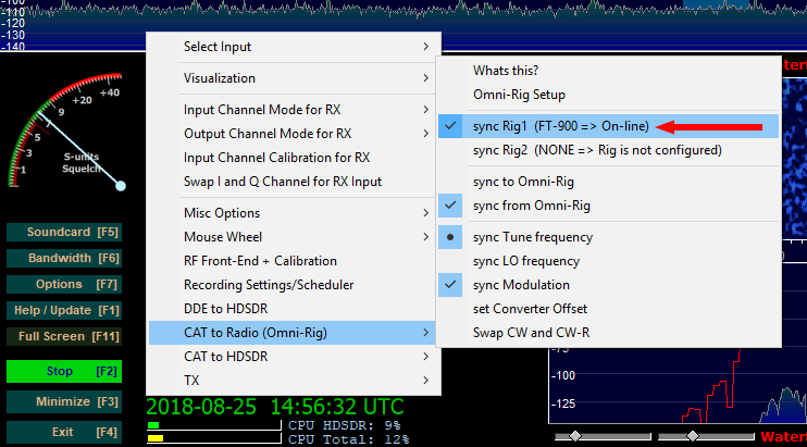 Теперь Options —> CAT to Radio —> sync Rig1. Остальные галочки тоже выставляем как на скриншоте: