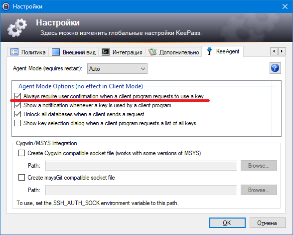 Идём в меню Сервис → Настройки. И там открываем вкладку KeeAgent. На ней ставим галочку «Always require user confirmation when a client program requests to use a key» (Всегда запрашивать подтверждение пользователя, когда клиентская программа запрашивает ключ):