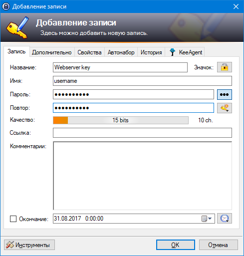 Теперь добавляем новую запись в базу. Название и имя — на своё усмотрение. А вот пароль вводим от нашего приватного ключа: