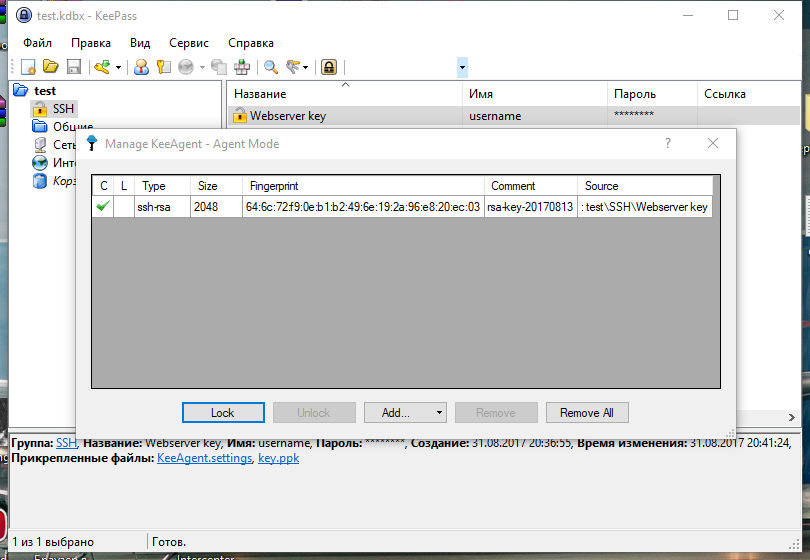 Всё, теперь при открытии базы KeePass все ключи будут автоматически подгружаться во встроенный агент ключей. Подключенные ключи можно просмотреть в меню Сервис → KeeAgent: